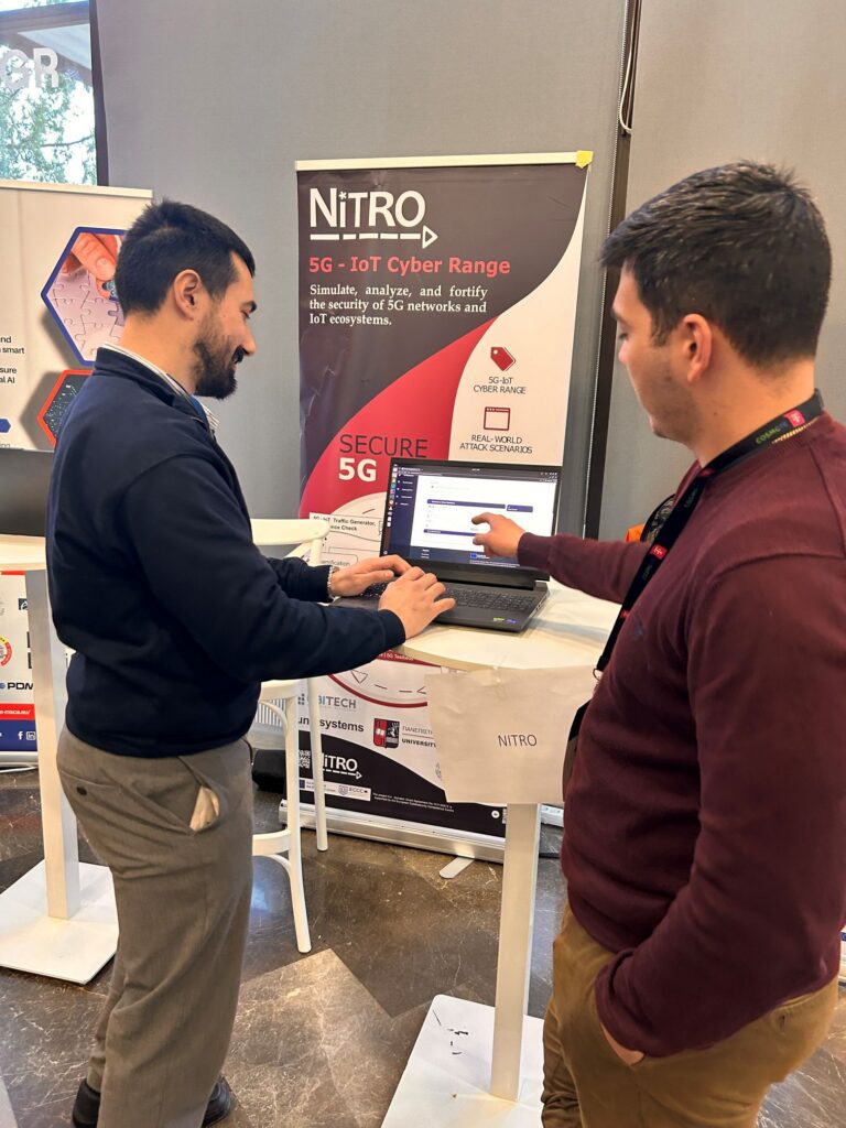 In addition to the project overview, the researchers offered a sneak preview of the NITRO platform, providing the audience with early insights into its capabilities. NITRO delivers an advanced cyber range tailored for 5G and IoT environments, enabling realistic experimentation, training, and evaluation of security mechanisms. A key focus of the discussions with the audience was the platform’s support for adversarial AI–driven attacks.
